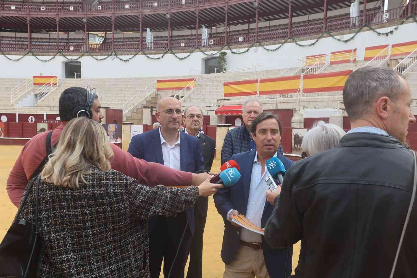 El empresario de Lances de Futuro, José María Garzón, ha presentado en el ruedo de La Malagueta esta muestra junto al diputado de Cultura, Manuel López Mestanza.