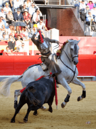 Lea Vicens cuajó una buena actuación en el tercero, un toro de Pallarés que tuvo más movilidad. La rejoneadora francesa cabalgó y templó embestidas a lomos de ‘Bético’ y ‘Bazuka’ en banderillas. Clavó rosas sobre ‘Jazmín’ manteniendo un alto nivel. Todo lo emborronó por la espada. Fue silenciada.