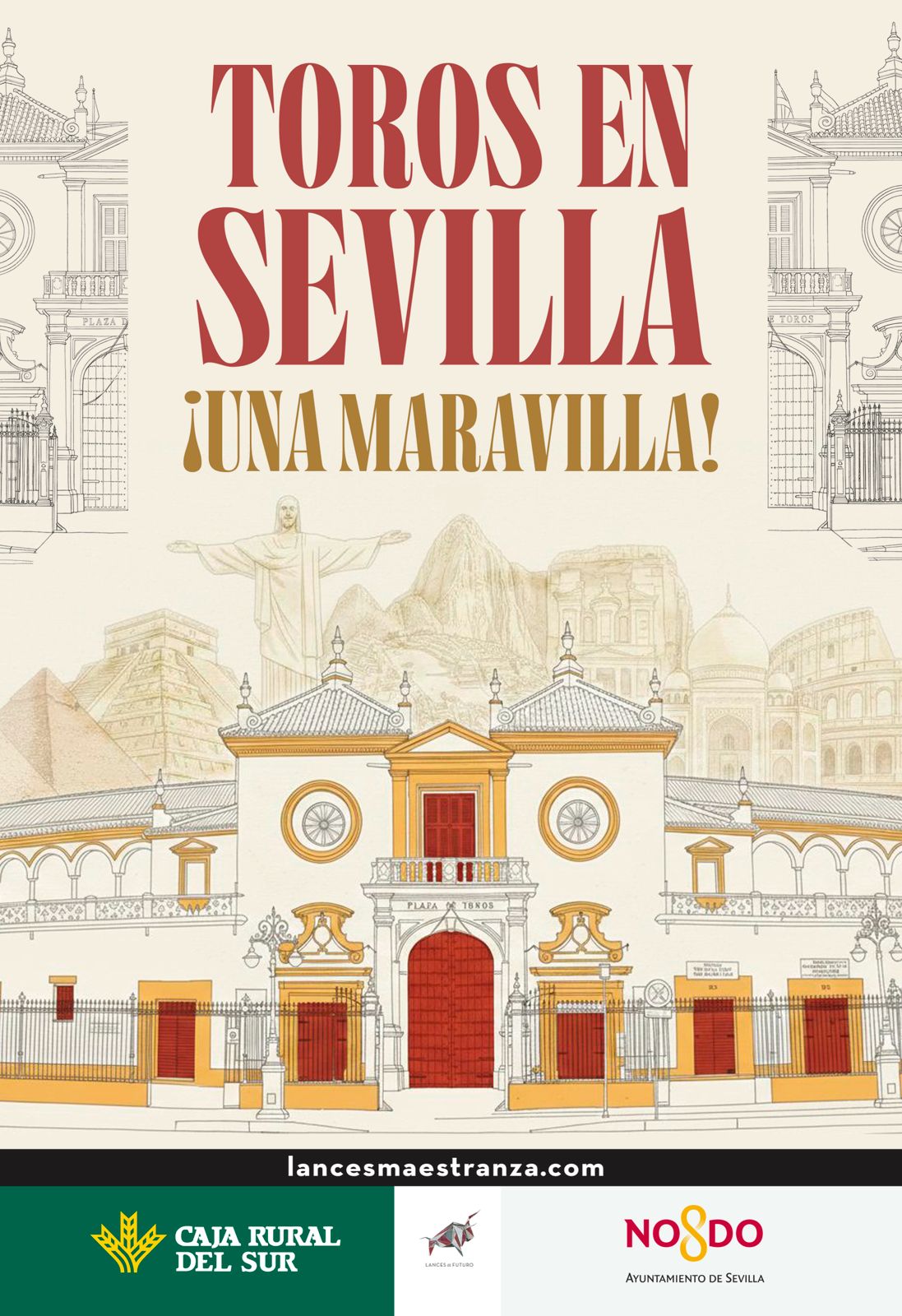 La estrategia de medios incluye una amplia campaña exterior con 400 banderolas en las calles de Sevilla, combinando imágenes de toreros con monumentos icónicos del mundo: