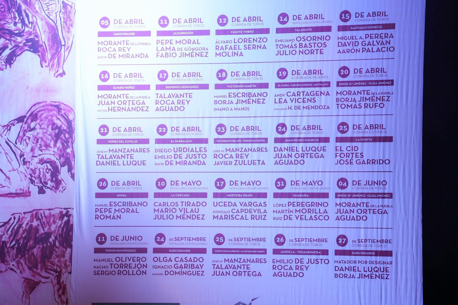 El momento más esperado ha sido la revelación de los carteles de la temporada, un cartel gigante se ha desplegado sobre el escenario con todos los festejos de la temporada,  con una pintura de Georg Dokoupil, de la que Morante de la Puebla es el protagonista absoluto.