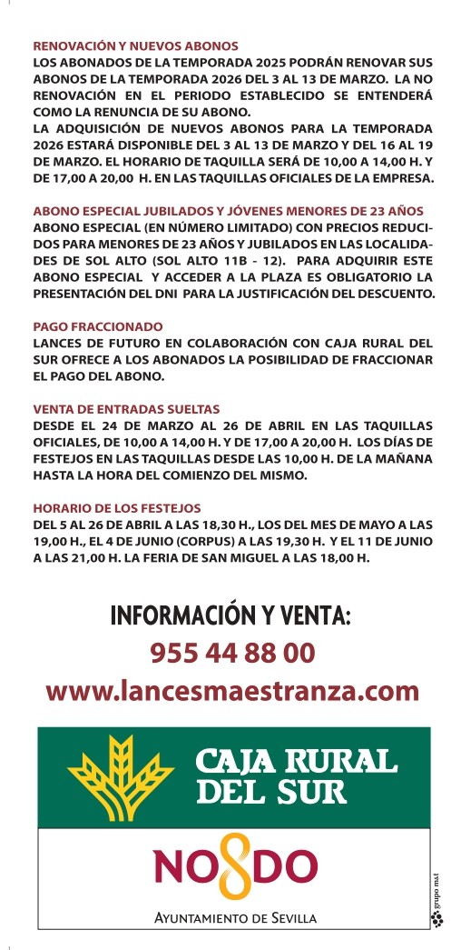 Lances de Futuro abre mañana martes, 3 de marzo, la renovación y venta de abonos 2026 en La Maestranza con atractivas ventajas para el abonado