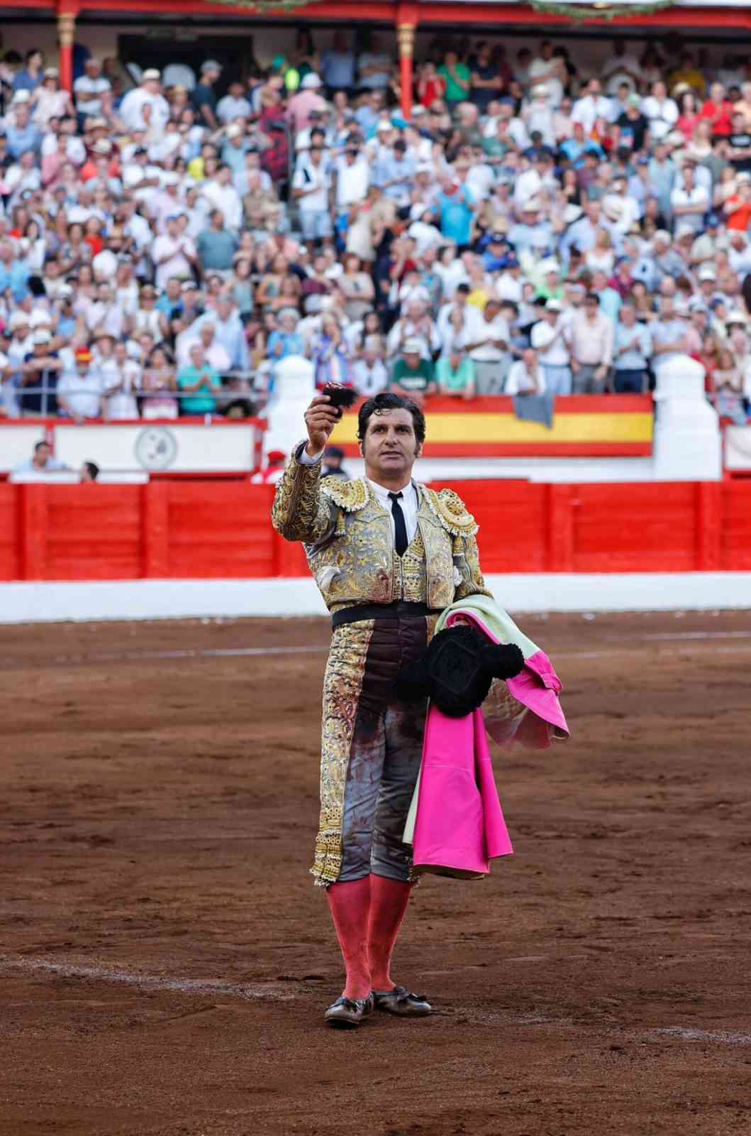 Morante reaparecía en Santander y pegó una ramillete de verónicas, con su estética propia. Meció el capote templado y con armonía. Luego vino el quite por chicuelinas, para luego comenzar por alto una faena con ayudados por alto. Tandas por el derecho rotundas, pasándose muy cerca al de Domingo Hernández. Estocada y oreja de un toro que brindó a su apoderado Pedro Marques.