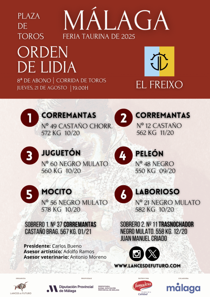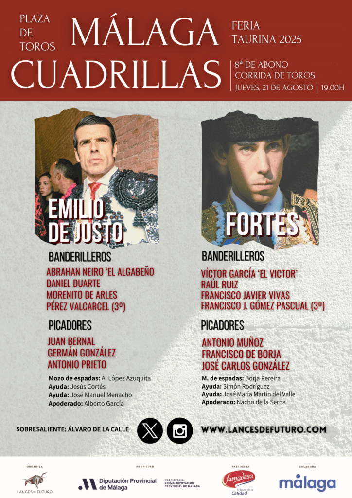 agosto 19, 2025 Málaga, Noticias PROGRAMA DE MANO. FERIA DE MÁLAGA 2025 JUEVES, 21 DE AGOSTO. CORRIDA DE TOROS. EMILIO DE JUSTO Y FORTES. MANO A MANO. TOROS DE EL FREIXO ORDEN DE LIDIA CUADRILLAS FOTOS DE LA CORRIDA 49 12 60 48 56 21 PrevANTERIORTarde triunfal de David de Miranda, tres orejas y puerta grande en La Malagueta SIGUIENTELuque abre la puerta grande de Málaga tras cortar tres orejasNext Search Search RECIENTES Las figuras del toreo vuelven a Montoro en un festival de máxima categoría Ventura y Aguado abren la puerta grande en la última de la Feria de Almería PROGRAMA DE MANO. FERIA DE ALMERÍA 2025 Rotunda tarde de David de Miranda en la segunda de abono de Almería Daniel Artazos recibe el alta hospitalaria tras su grave percance en La Malagueta en el certamen de escuelas RELACIONADO PROGRAMA DE MANO. FERIA DE MÁLAGA 2025
