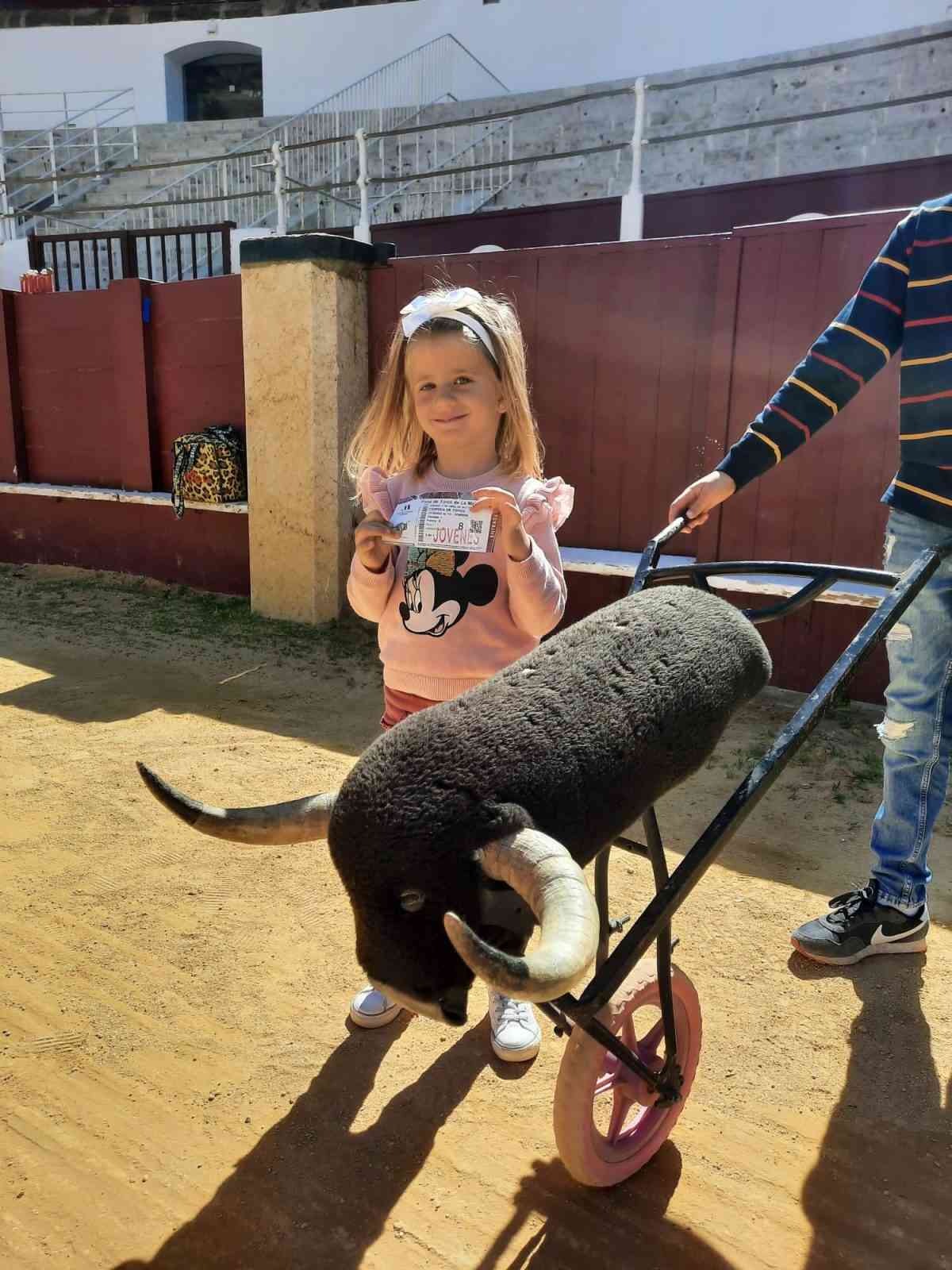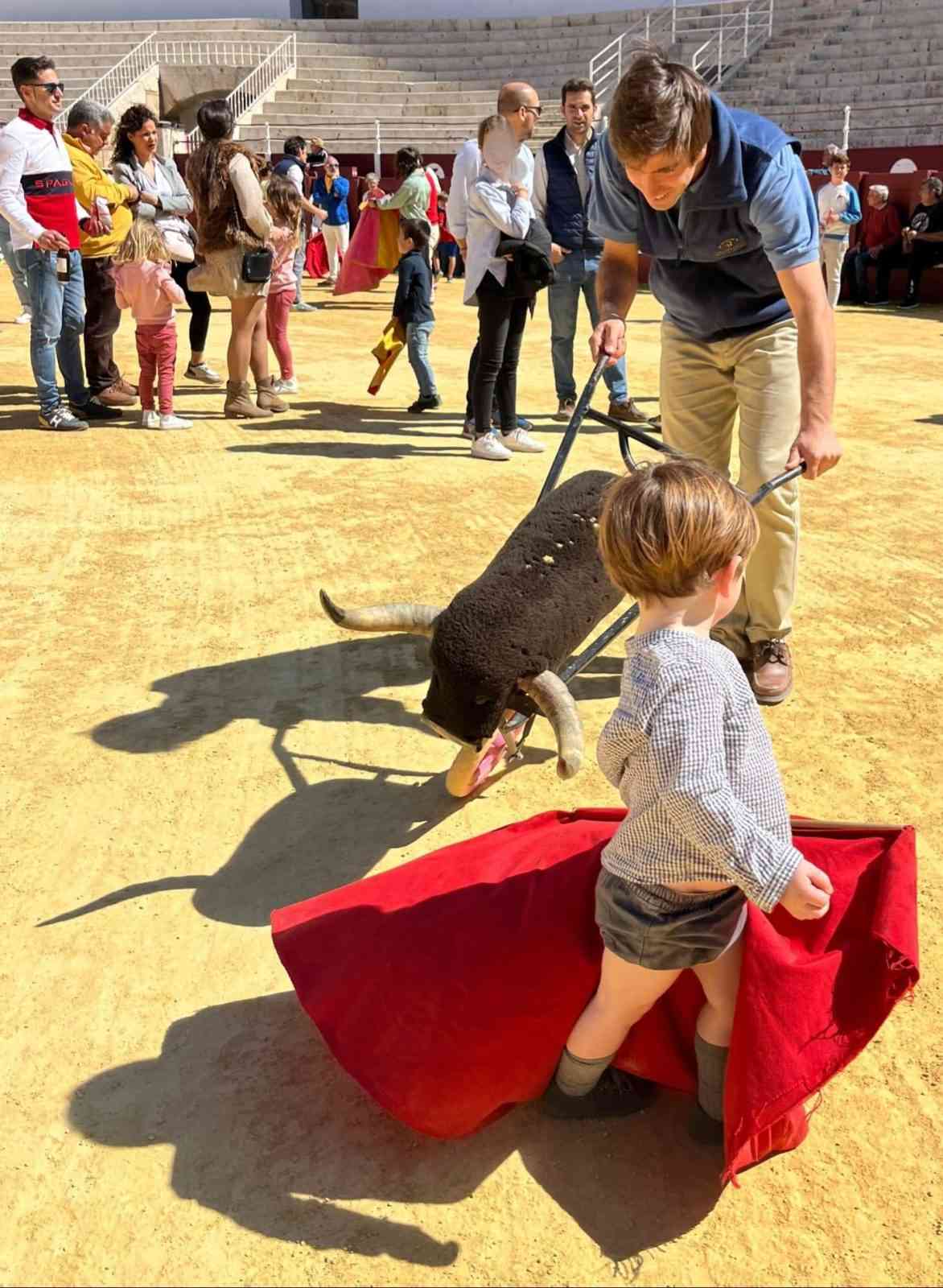 Ambientazo taurino en la plaza malagueña. Los niños han podido vivir la experiencia de montar en un caballo de picar o de tocar los trastos, además de probar su habilidad con capotes y muletas, e incluso poner pares de banderillas en el carretón que simula a un toro bravo.